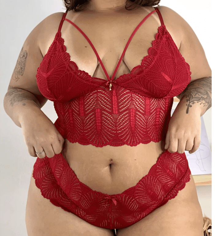 Conjunto Plus Size feito em renda de alta qualidade super elástica e macia. O sutia não tem bojo, contém forro, as alças são reguláveis de tamanhos com argola e regulagem de metal. A calcinha é toda em renda no estilo calesson, com forro 100% algodão.