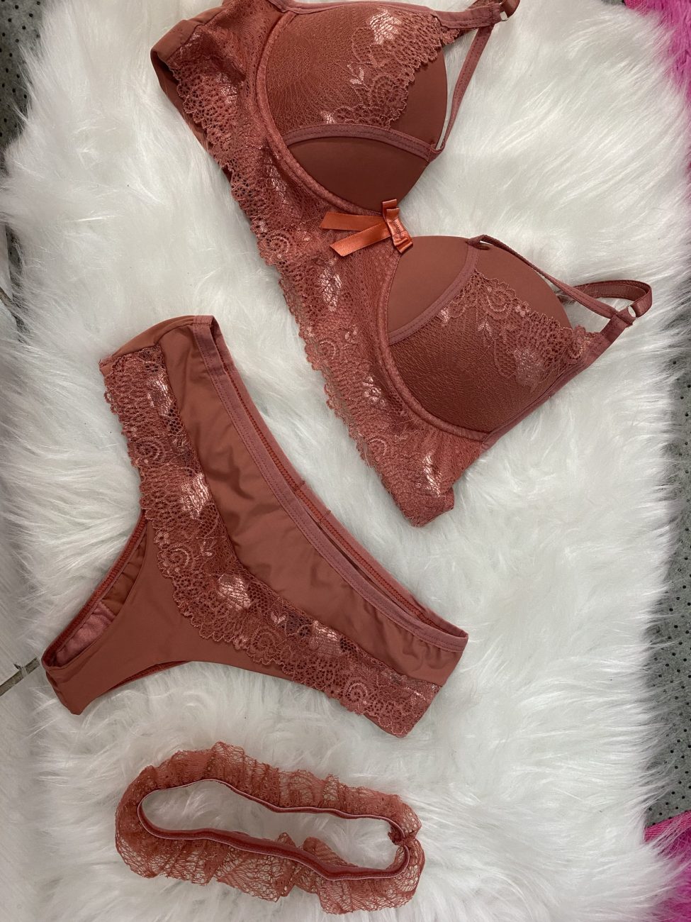 Sutiã com bojo e aro, detalhe elastico + calcinha fio microfibra e renda atrás + persex